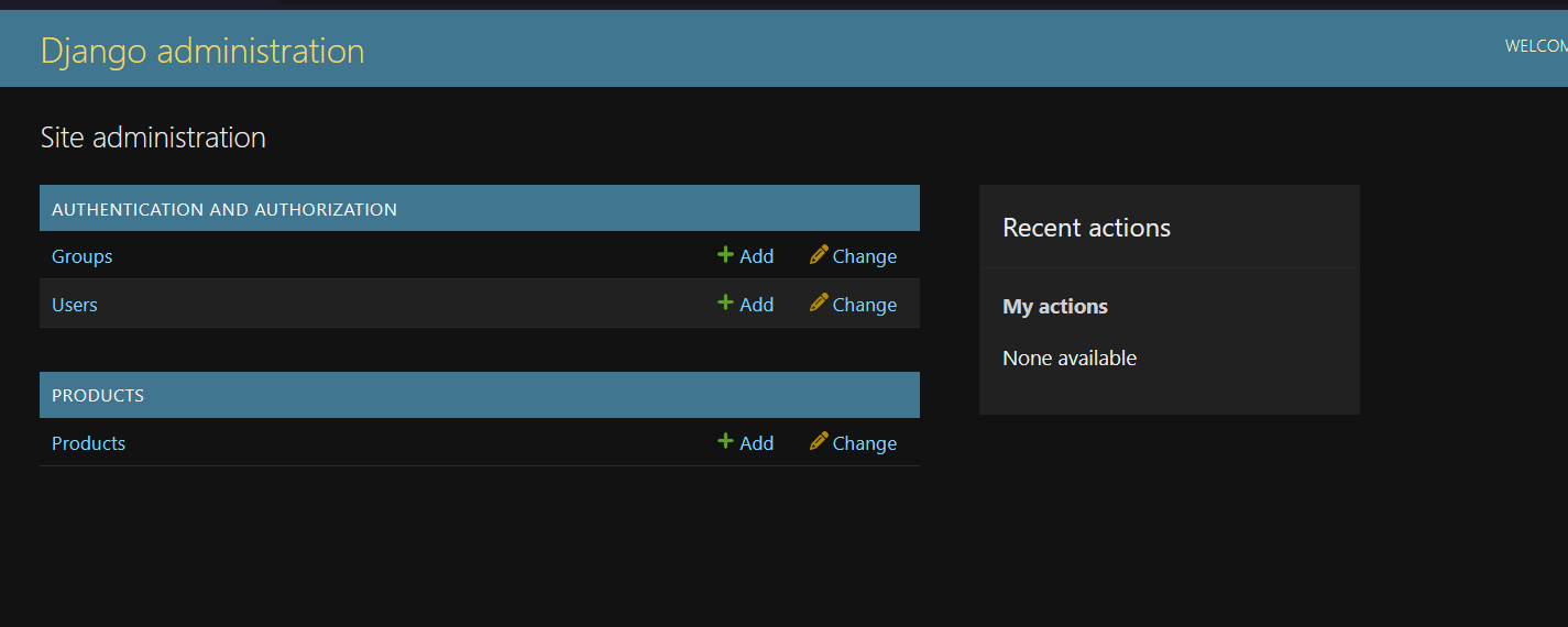 Restart your server and navigate to http://localhost:8000/admin. Log in with your superuser credentials. You should see the Django admin dashboard: