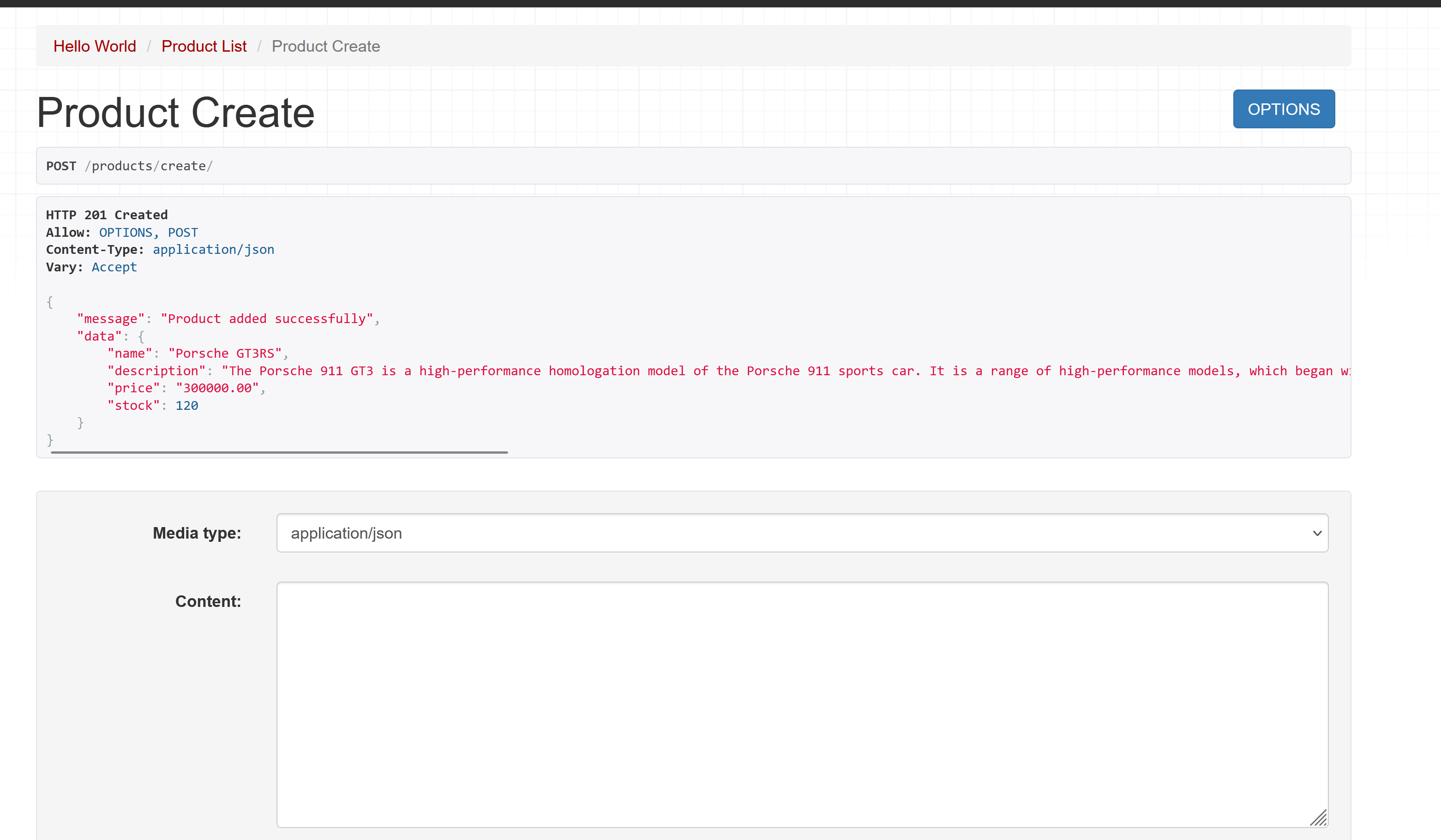 Navigate to http://localhost:8000/api/products/create to test the endpoint: