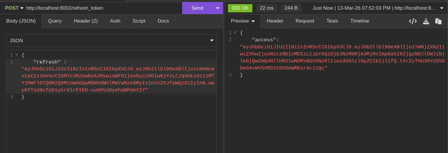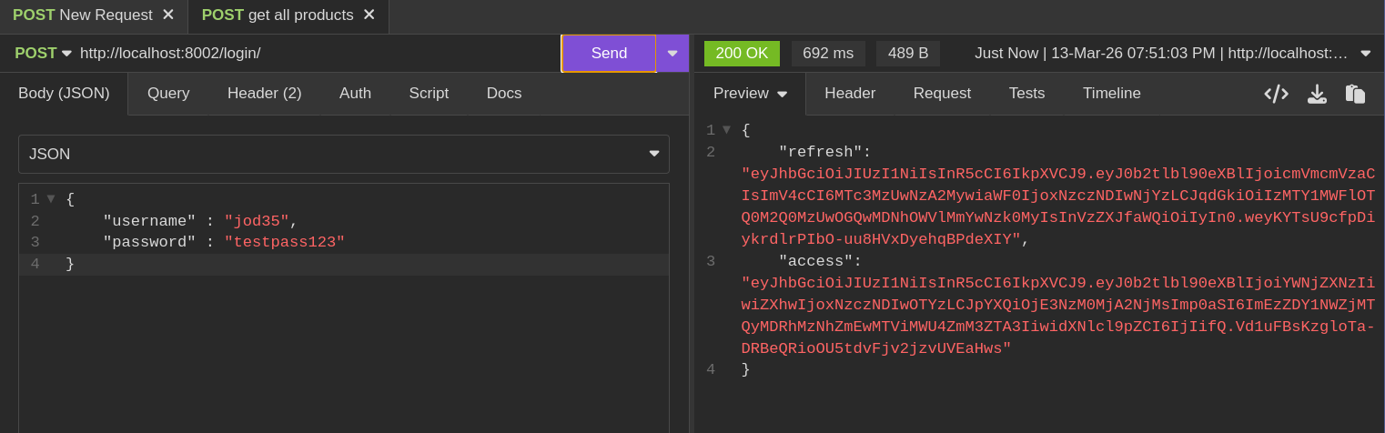 The initial login returns both access and refresh tokens to the client.