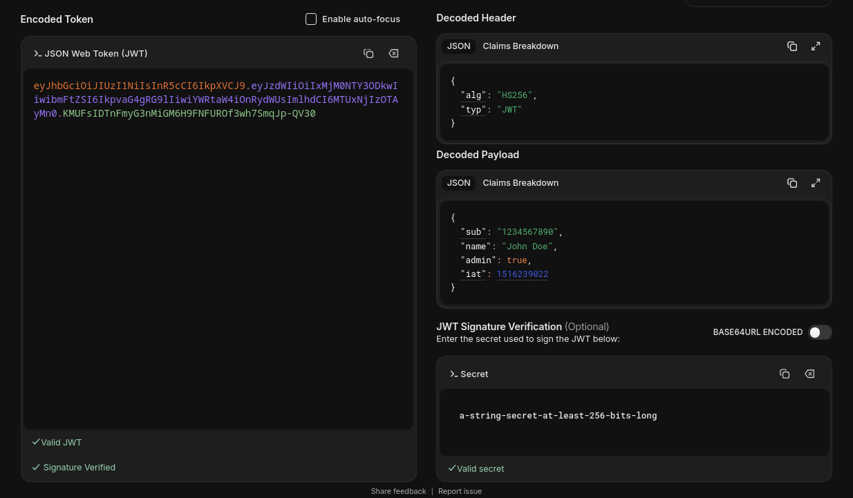 - Payload: The payload contains the "claims." These are statements about the user and additional data, such as the user ID or expiration time. While this data is encoded and protected against tampering, it is not encrypted, meaning sensitive data should not be stored here.